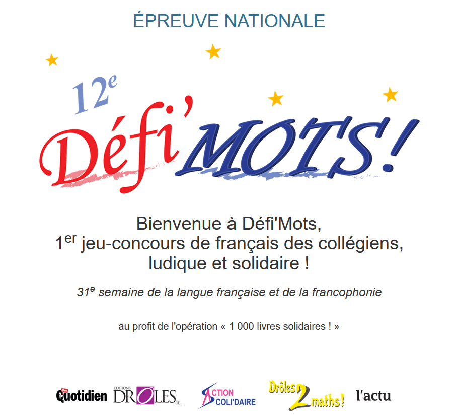 Le Défi'Mots 2025 aura lieu le 27 mars. La participation est financée par le FSE. Défi'mots est un concours avec des lots à gagner et un projet solidaire une partie des bénéfices permettent d'offrir des livres à des associations d'aide aux enfants.